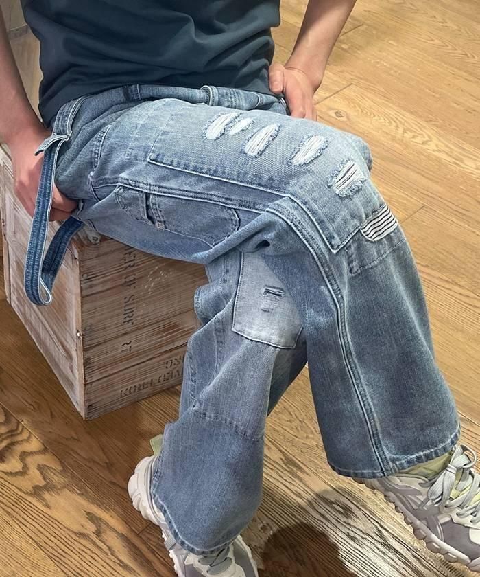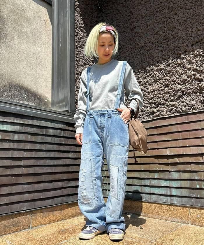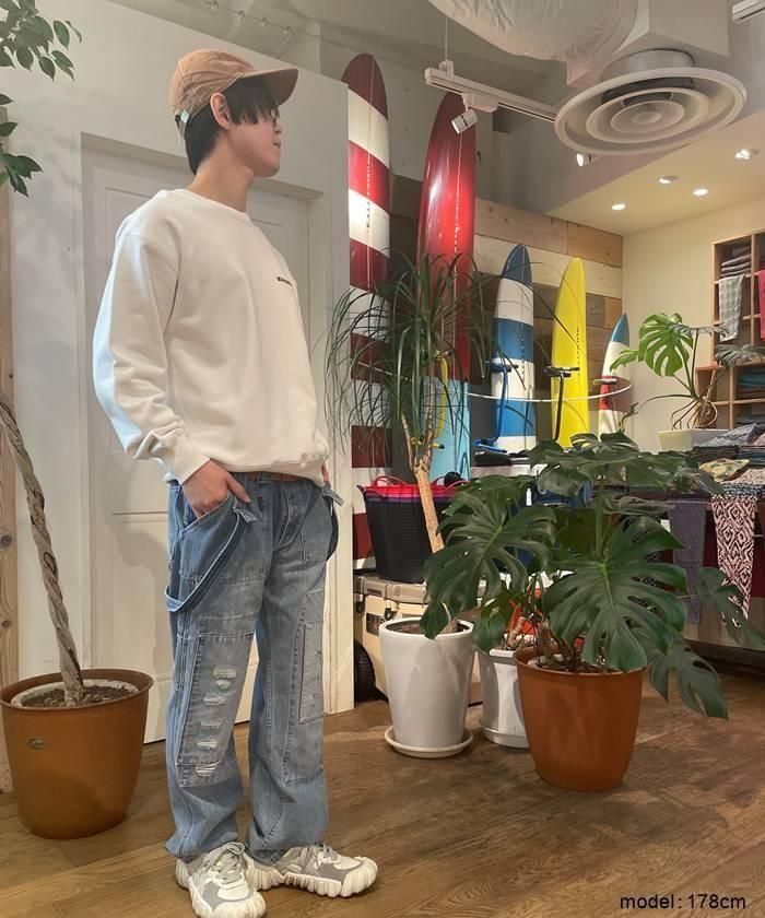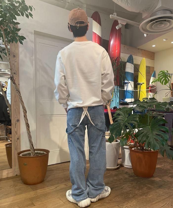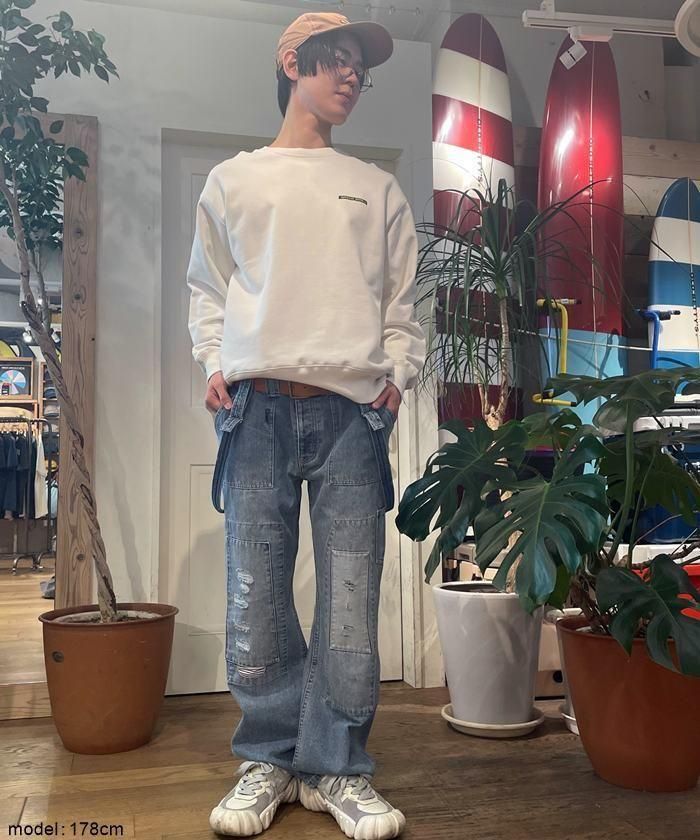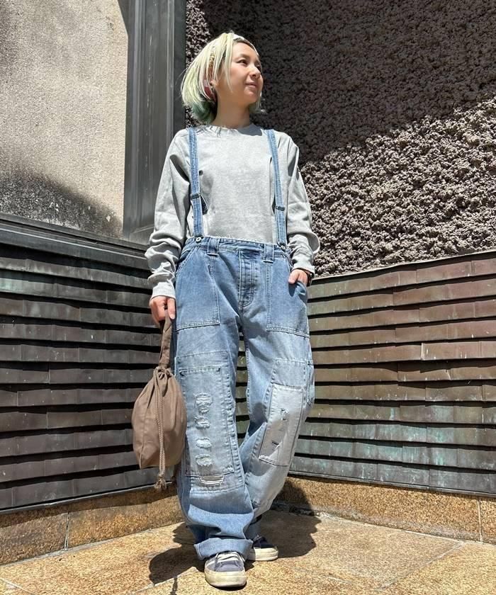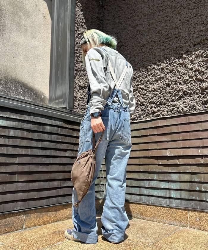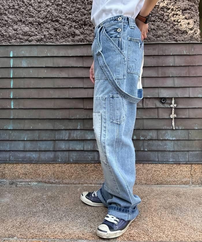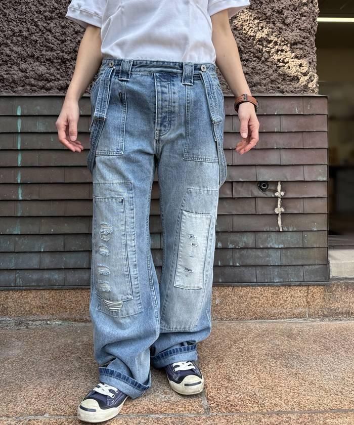 11oz ムラインディゴデニムを使用したサスペンダーパンツ。 特殊な洗い加工やダメージ加工を施す事で、ヴィンテージ風の外観に仕上がっています。 オーバーサイズのオーバーオールを、リメイクした様なディテールがポイントです。ウエスト横のボタン開きになります。