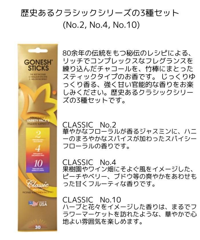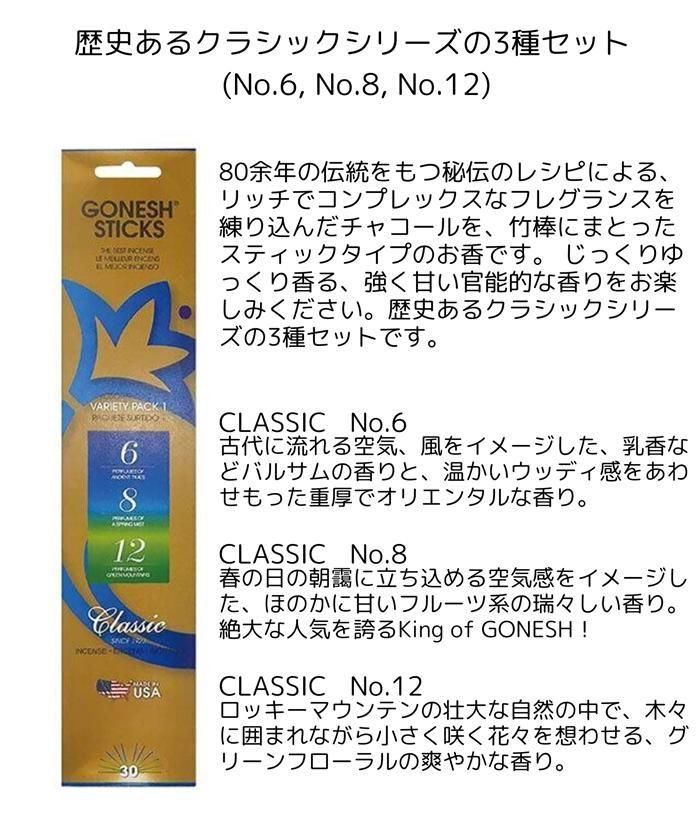 90年の伝統をもつ秘伝のレシピによる、リッチでコンプレックスなフレグランスが練り込まれたチャコールを使用してます。じっくるゆっくり立ち上がる、強く甘い官能的な香りをお楽しみください。Classicは1965年のGONESHのデビュー以来続くシリーズ。
