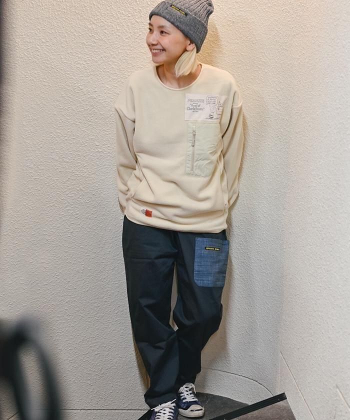ナイロン素材のポケットや、左胸に施したプリントワッペンがアクセントになっています。