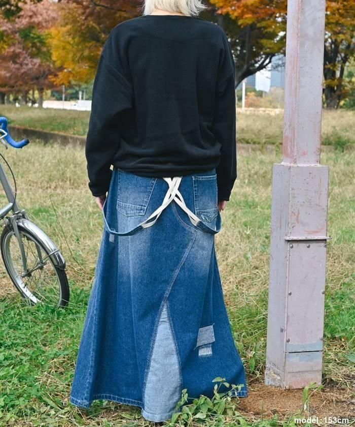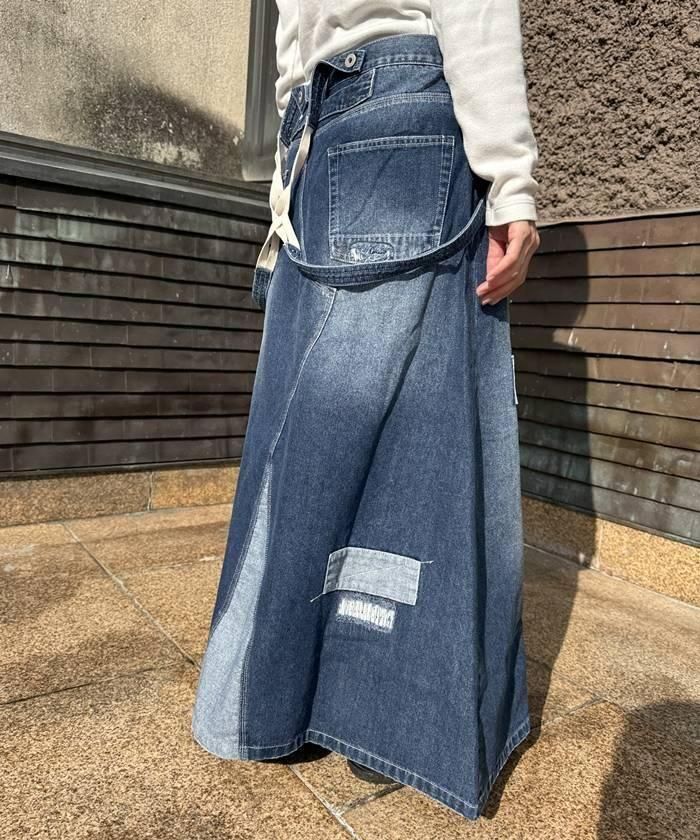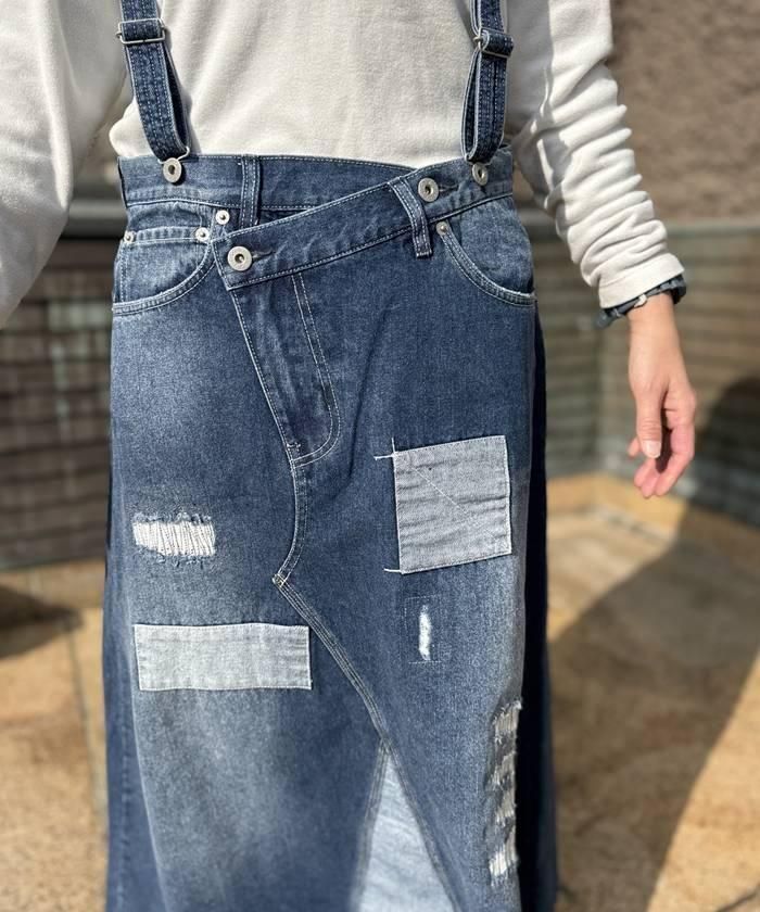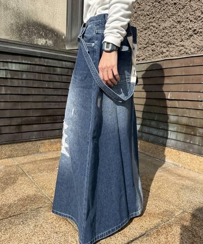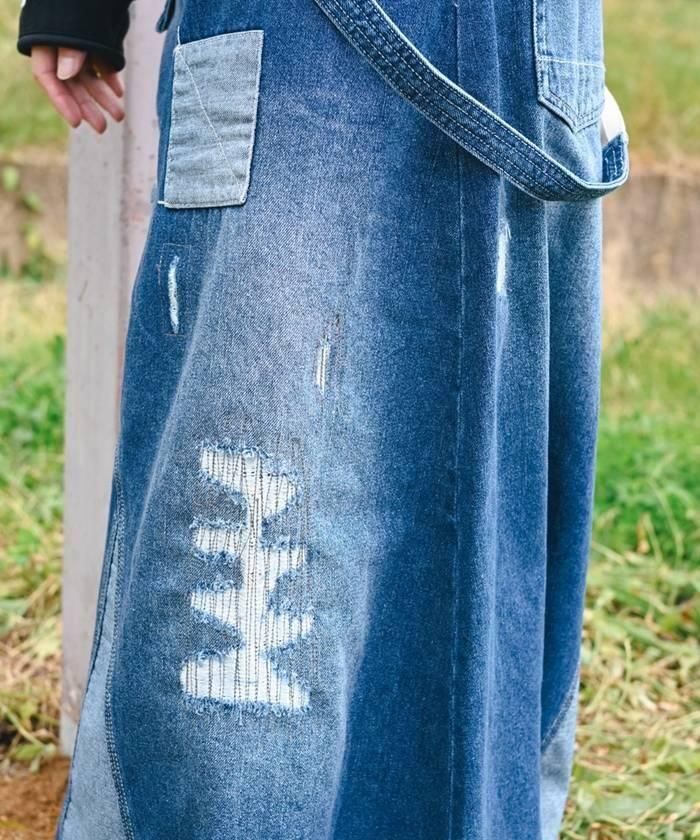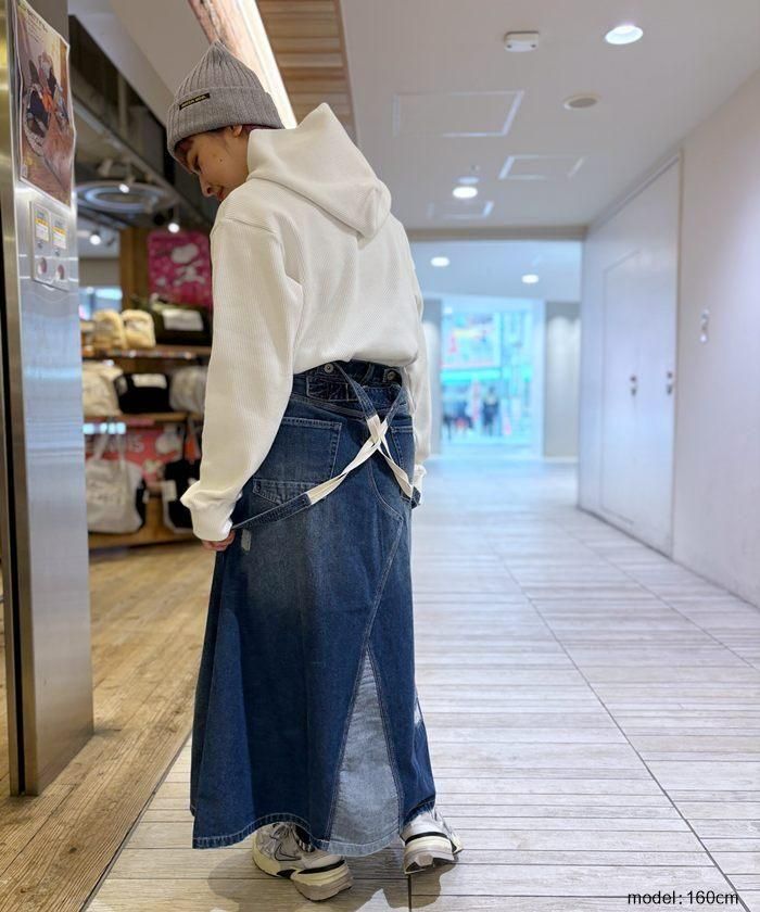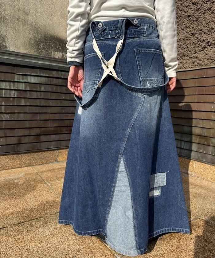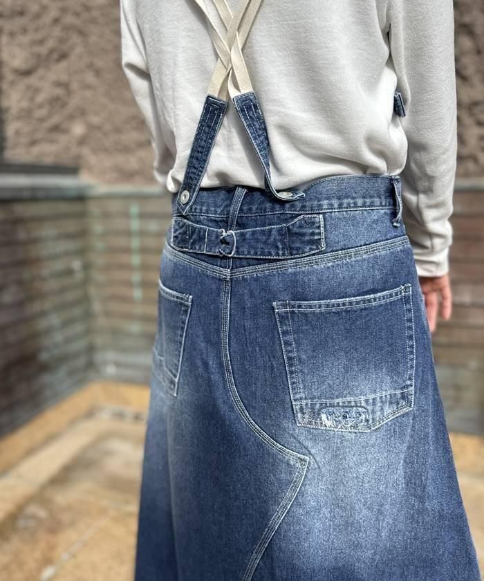 120z ムラインディゴデニムを使用したサスペンダースカート。