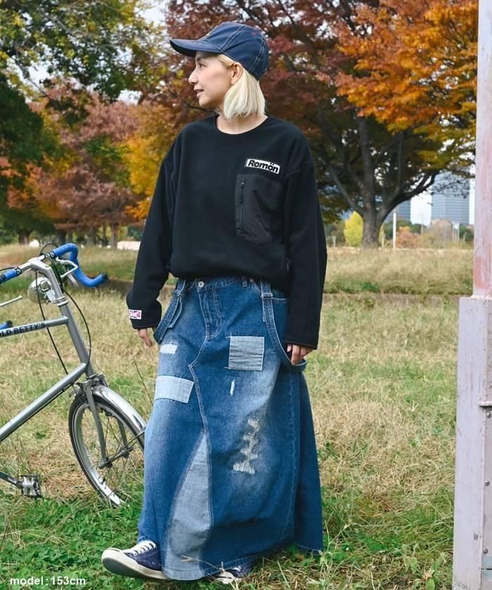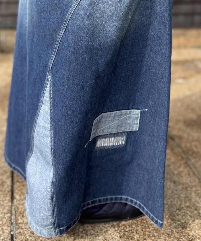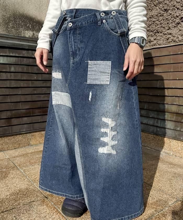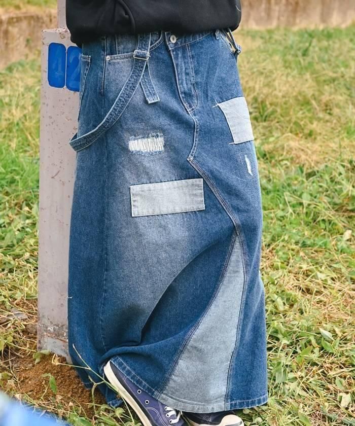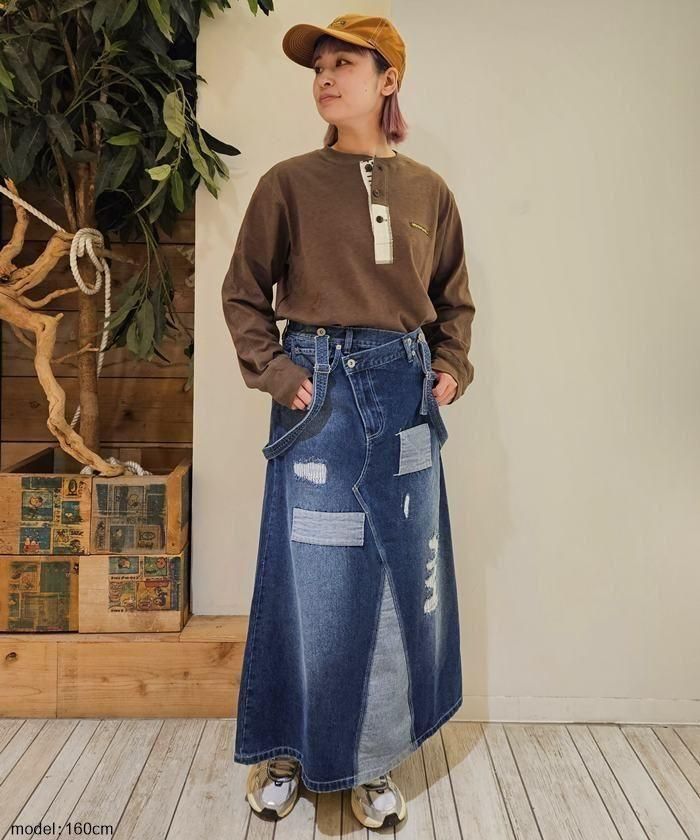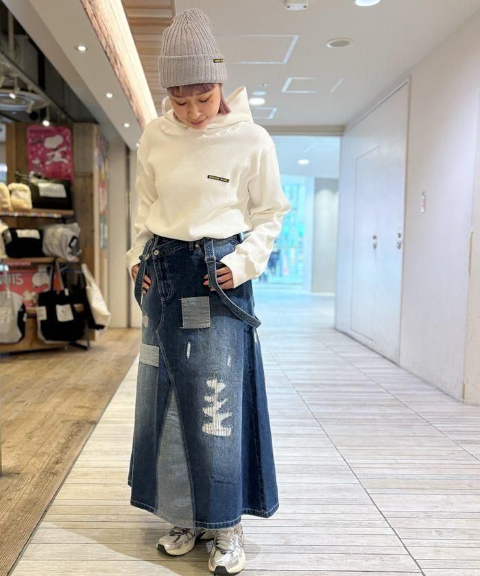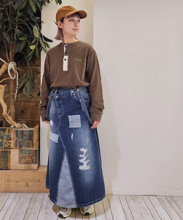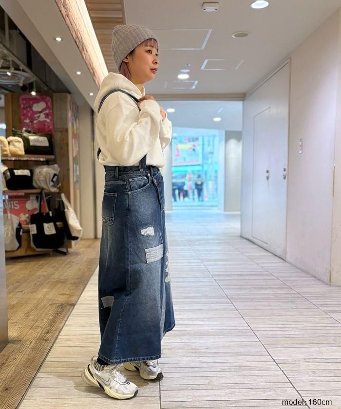 120z ムラインディゴデニムを使用したサスペンダースカート。