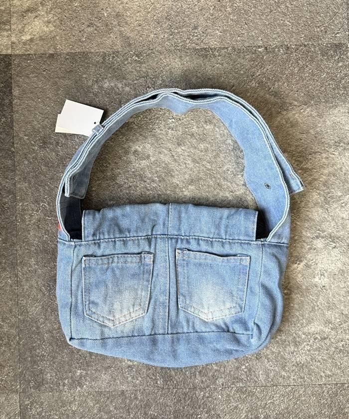 特殊な洗い加工を施す事で、ヴィンテージ風の外観に仕上がっています。共布の裏地付きで、肩ベルトはスナップボタンでサイズ調節が可能です。釦を留める所で、肩掛けやウェストポーチの仕様になるアイテムです。